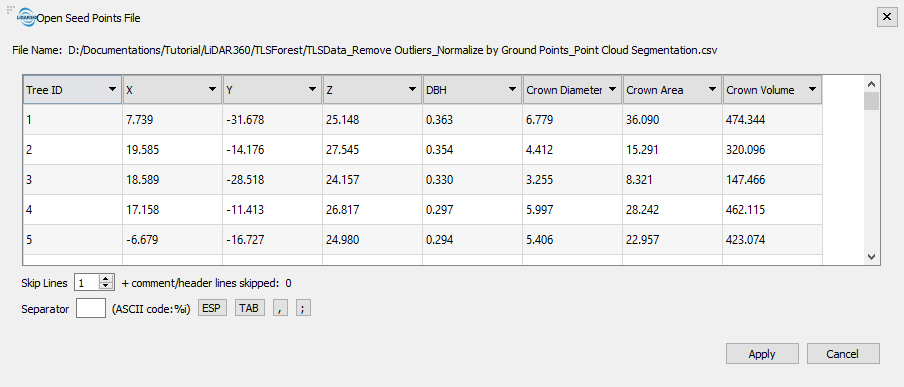 2 Navigate to Editor > Open Seed Points File to load the .CSV result from Exercise 3 into the TLS Editor. Set Skip Lines to 1 and click Apply.